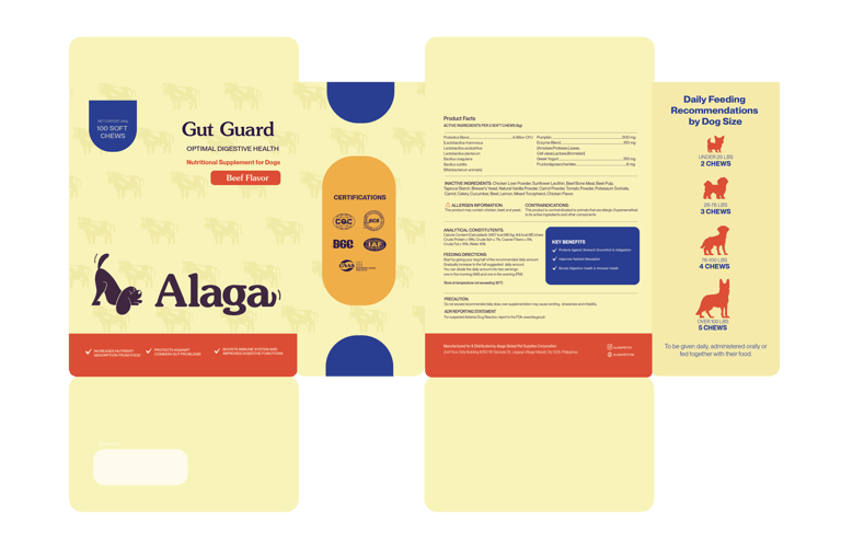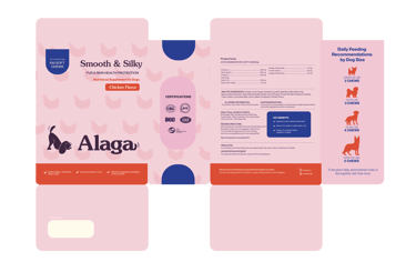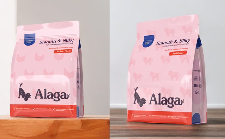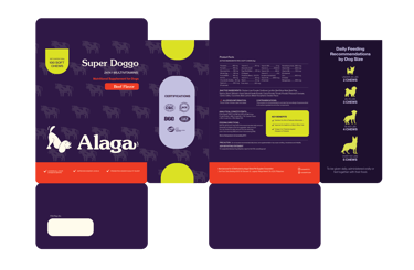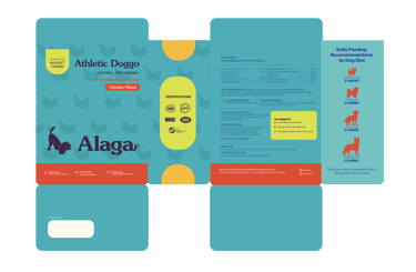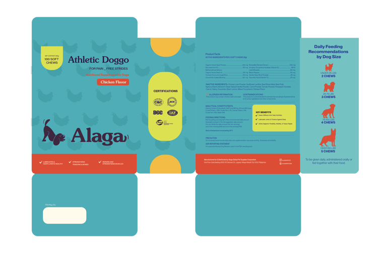 laid out the Alaga packaging to be playful and instantly recognizable as a product made for dogs. The design uses friendly typography, bright and engaging colors, and clear visual hierarchy to communicate that it’s a pet supplement while keeping the packaging fun and approachable. I made sure the layout clearly highlights key information, making it easy for pet owners to understand the product’s benefits at a glance. Overall, the design balances playfulness with clarity, creating packaging that feels caring, trustworthy, and suitable for everyday use.