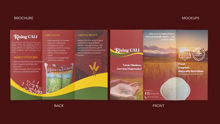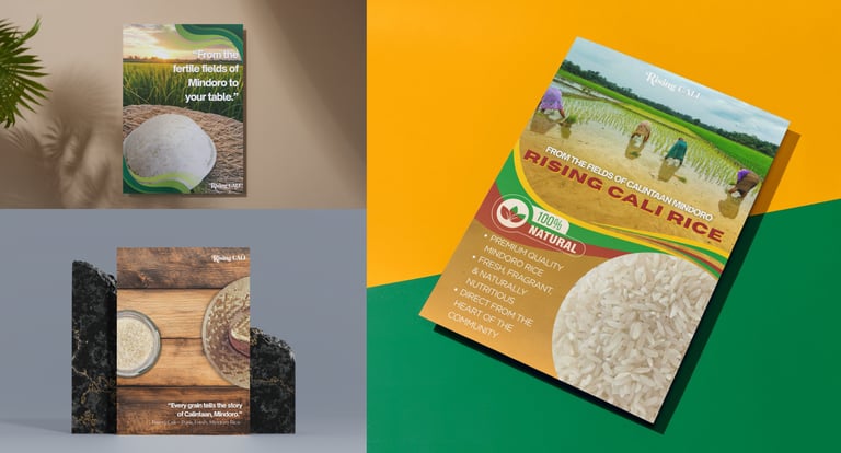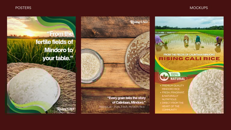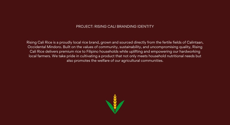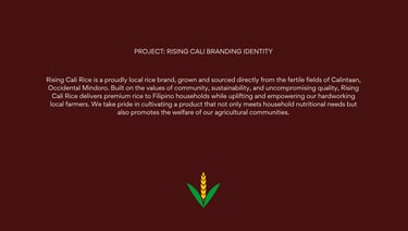 Rising CALI’s branding embodies pride, purpose, and progress for Filipino farmers. It highlights that rice is more than just food it’s a symbol of unity, resilience, and nation-building. Through bold storytelling, authentic visuals, and a modern yet grounded identity, Rising CALI bridges the gap between consumers and local farmers, inspiring every Filipino to choose rice that uplifts lives and sustains our land.
